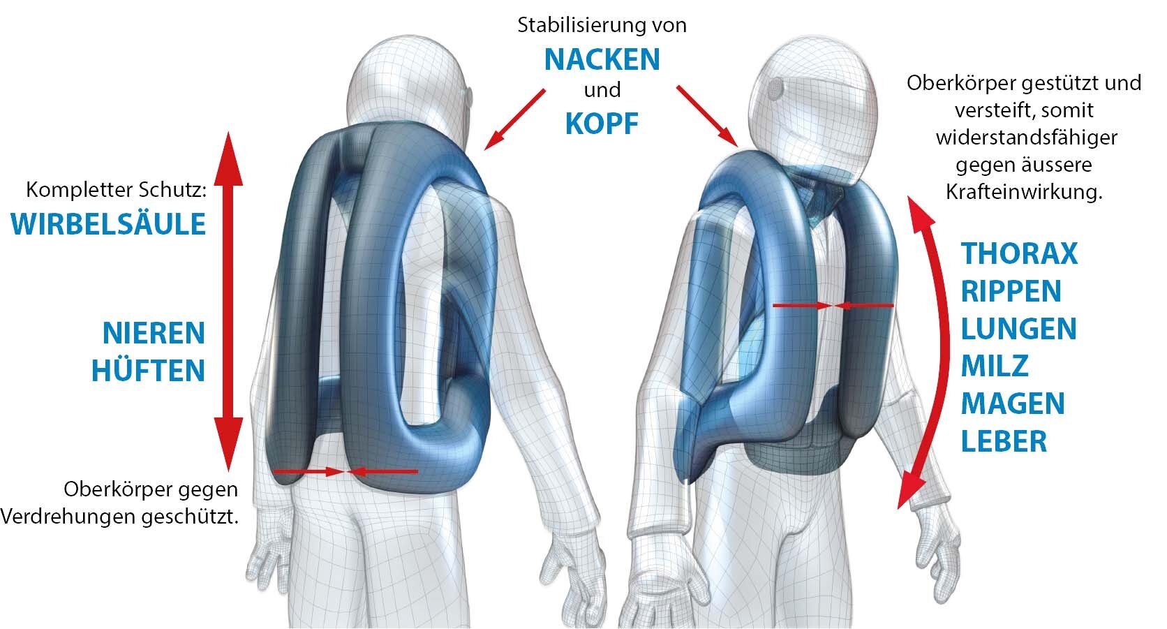 Innerhalb von 80-100ms (je nach Füllvolumen) wurde der Airbag vollständig mit CO2 gefüllt und bietet nun optimalen Schutz gegenüber einem Aufprall. Der Airbag bleibt ca 2-3 Minuten prall gefüllt, bis er nach ca 5-10 Minuten seine Luft langsam verliert. Das Airbag-System kann nun wieder verwendet werden.