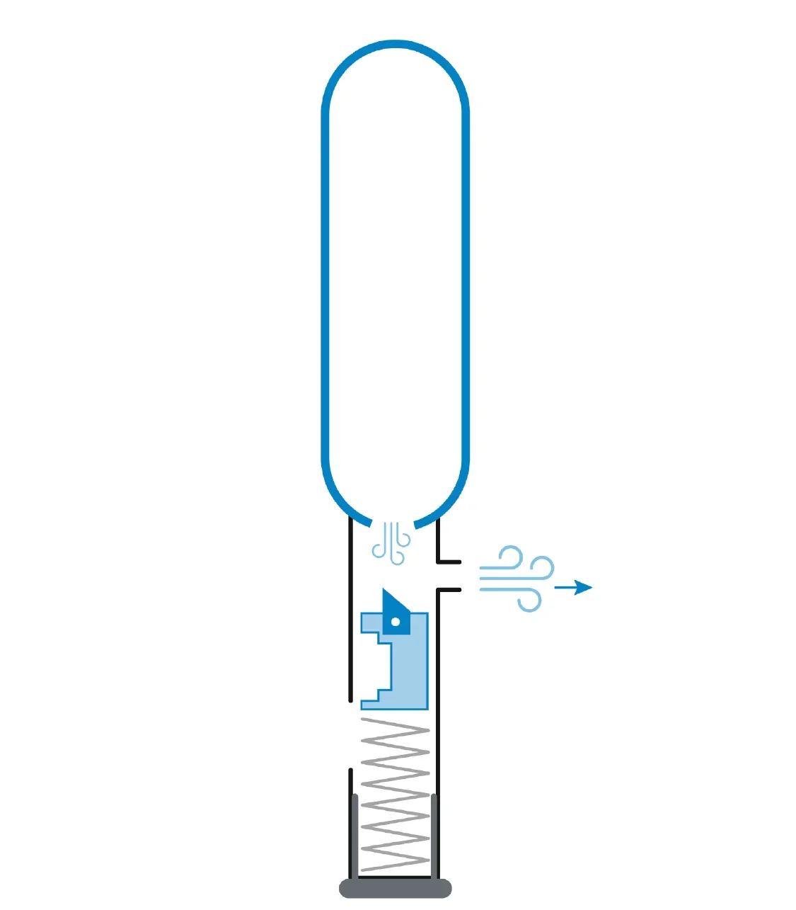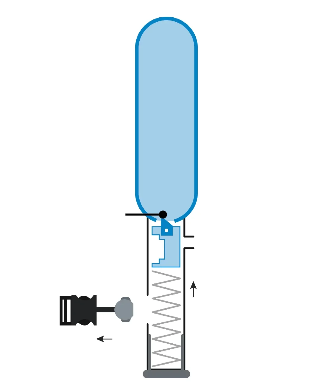 Durch die Verschlusskappe wird die Feder gegen den Kolben gedrückt. Die Metallkugel (mit der Reißleine verbunden), die den Kolben arretiert, sorgt dafür, dass die Feder beim Eindrehen der Verschlusskappe gespannt wird. Die Federkraft liegt nun vollständig an.